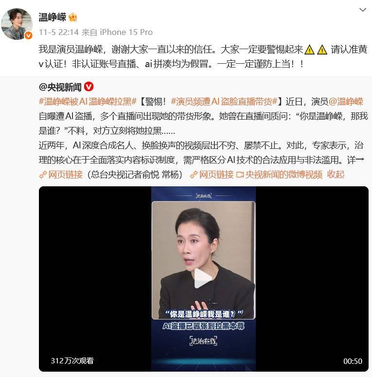 此前,据现代快报消息,近日,社交平台上出现“温峥嵘团队把假货和AI联系起来了”“温峥嵘AI事件反转”“温峥嵘疑似翻车了”“曝温峥嵘卖面膜出事把锅推给AI”等热搜词条,引起网友热议。12月1日,温峥嵘发文称报警立案,并发出严正声明,部分内容如下:近期,网络上频繁出现以盗播、AI换脸等方式,非法使用温峥嵘女士形象售卖假冒伪劣产品的不法行为。经权威媒体曝光后,相关平台已对部分侵权人采取了封禁网络店铺、删除侵权作品、下架假冒伪劣商品等措施。不久后,该声明被删除。记者注意到,12月2日,温峥嵘个人账号发布了一条带货视频,暂时未对删除声明一事作进一步回应。